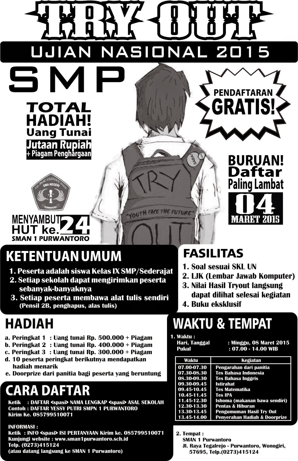SMAN 1 Purwantoro menggelar kegiatan Tryout SMP/Sederajat. Dengan mengikuti Tryout diharapkan siswa SMP lebih siap dalam mengikuti kegiatan UN yang dilaksanakan bulan mei mendatang. Kegiatan ini gratis tanpa dipungut biaya dengan total hadiah dan doorpize jutaan rupiah. Buruan daftar sebelum kuota habis !