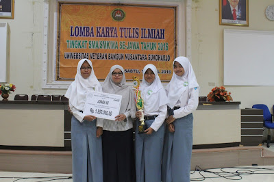 SMA MEWAH- Satu lagi torehan prestasi siswa SMAN 1 Purwantoro dalam ajang lomba karya ilmiah se Jawa yang diadakan oleh Universitas Veteran Bantara Sukoharjo, Sabtu (18/4). Dalam ajang karya ilmiah ini SMAN 1 Purwantoro berhasil meraih juara 3 bersaing dengan 32 judul penelitian, prestasi ini merupakan kemenangan berturut-turut selama tiga tahun terakhir.
